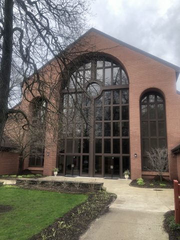 Enter the main driveway and drive through the canopy to the main lot, where visitor parking is available. The main entrance to the church is through the courtyard.